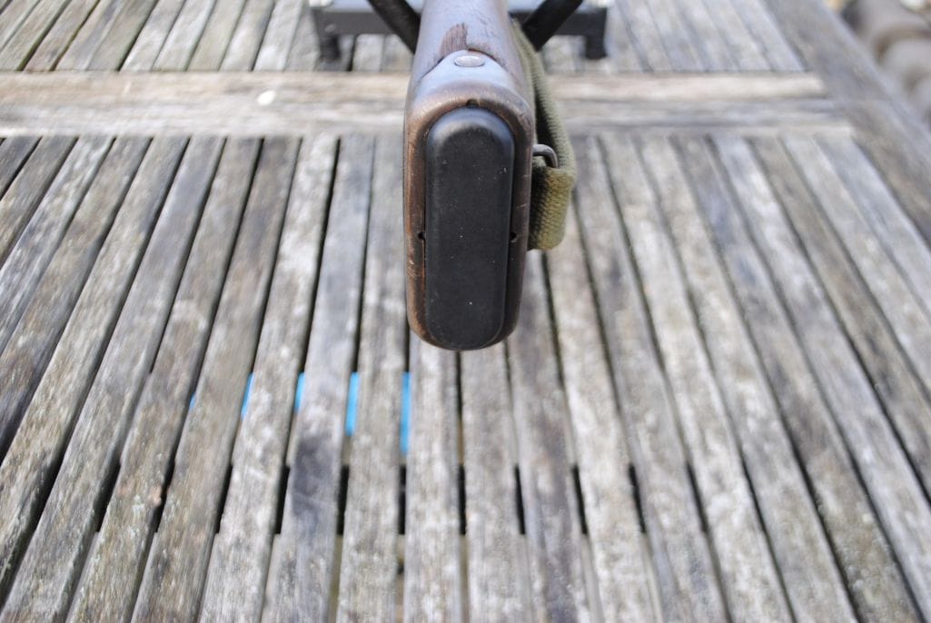The wood work is in nice condition; however, there is small damage to the edge of the stock at the top at the end cap, as noted in the pictures. The metal work retains most of its original factory finish